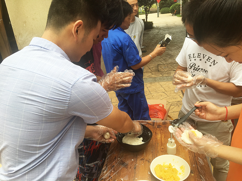 品嘗月餅也是中秋節(jié)的習(xí)俗之一,如果能品嘗自己親手制作的月餅,這個(gè)中秋節(jié)肯定更加難忘?;顒?dòng)第二項(xiàng)就是制作冰皮月餅,大家一邊自己動(dòng)手和冰皮、包餡、壓花定型,一邊相互交流著關(guān)于中秋和月餅的故事??此坪?jiǎn)單的制作過程,要做出漂亮的月餅也讓大家費(fèi)了不少心思。有些止不住饞的小伙伴,還沒等做完就迫不及待的嘗鮮了,也有些舍不得吃的,說要帶回家與家人分享。