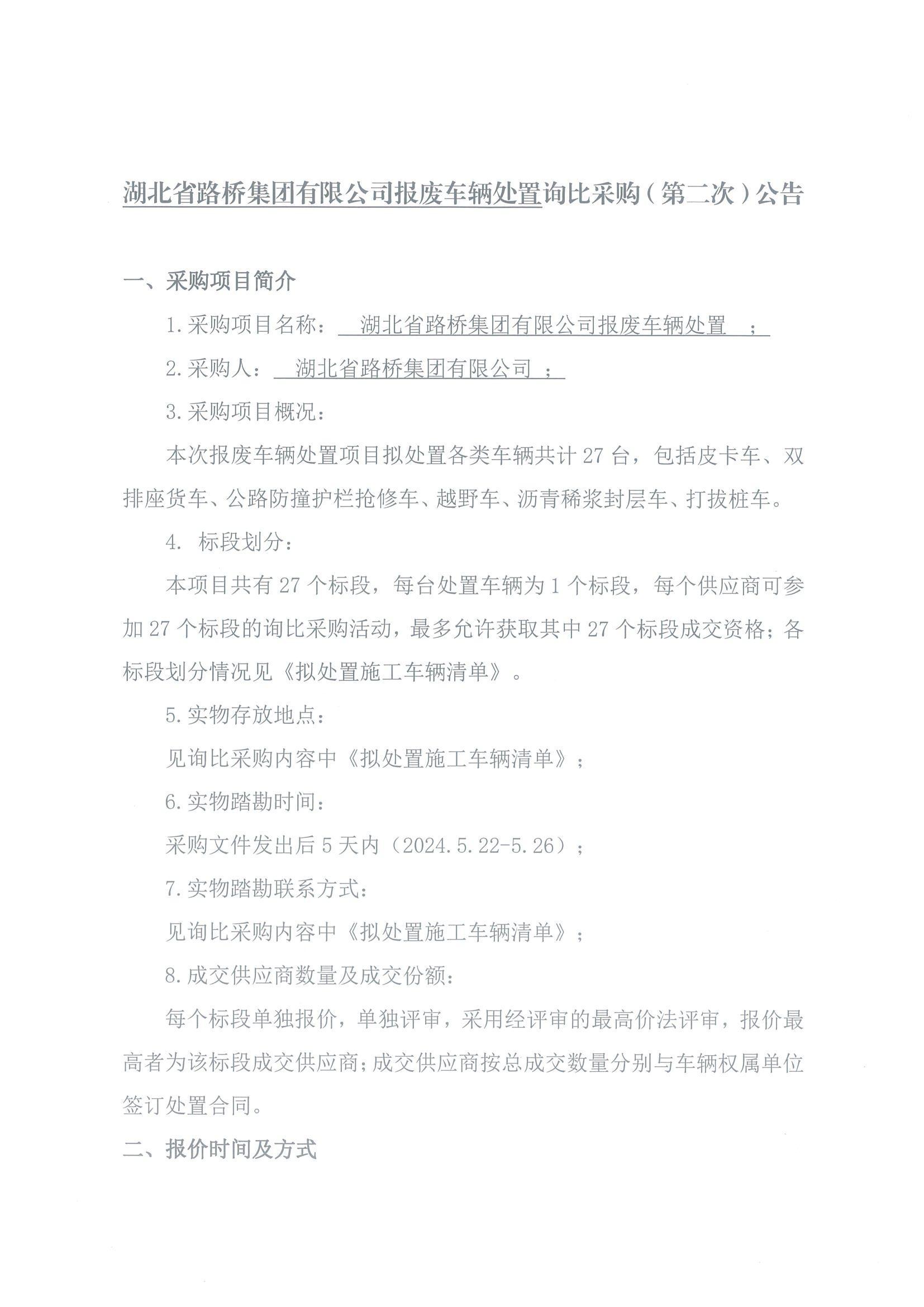 湖北省路橋集團(tuán)有限公司報廢車輛處置詢比采購(第二次)公告